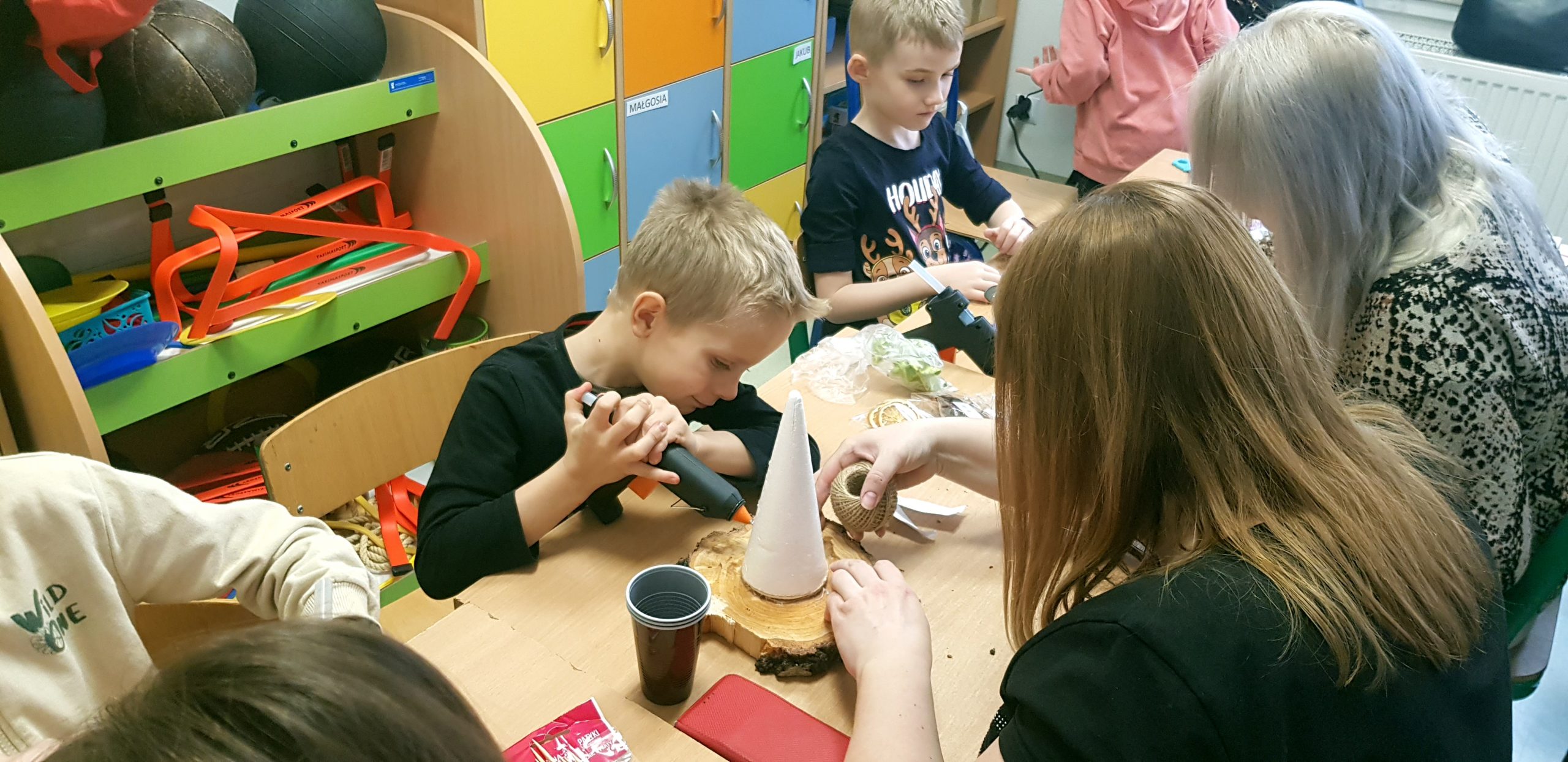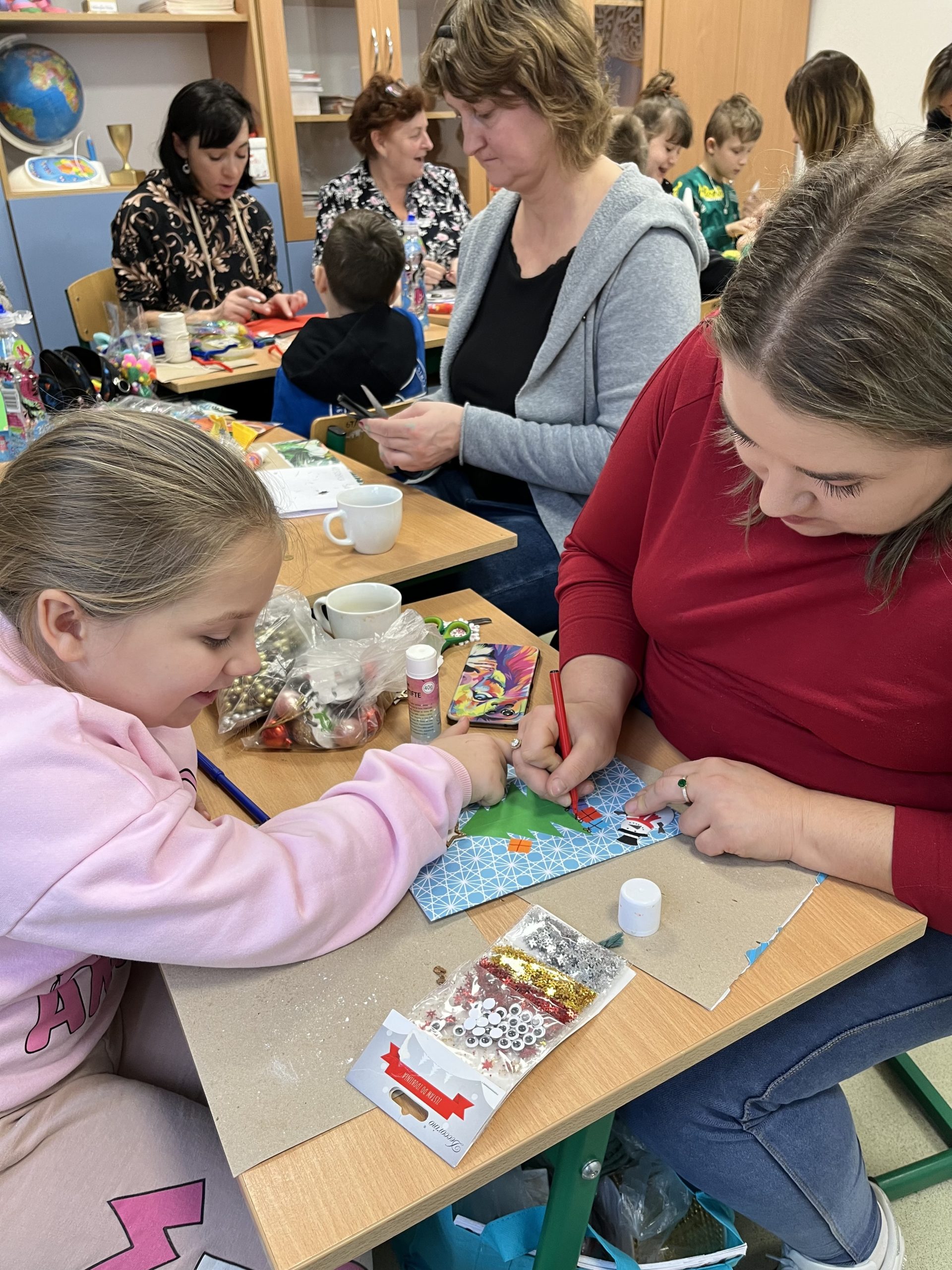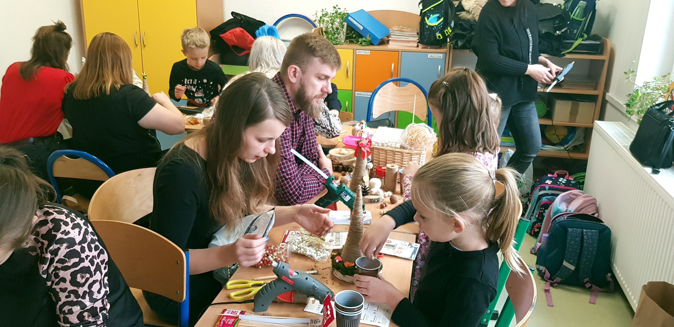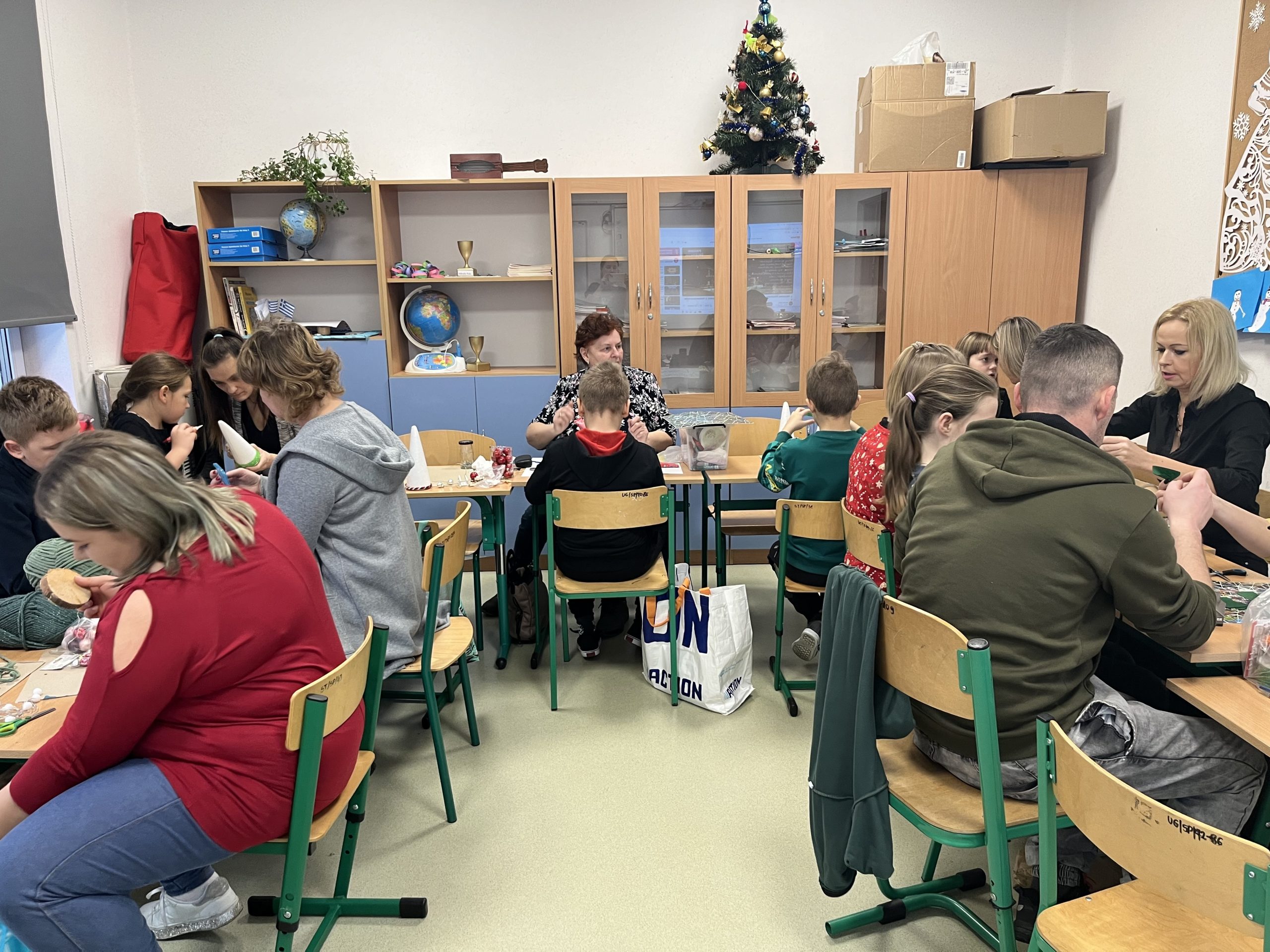 Przed świętami w klasach I-III odbyły się w naszej szkole międzypokoleniowe warsztaty świąteczne. Uczniowie zaprosili tego dnia swoich najbliższych, by wspólnie, przy dźwiękach świątecznych piosenek i pastorałek, wykonać piękne prace plastyczne. Celem spotkania była integracja międzypokoleniowa, ale także możliwość obserwacji dzieci przez bliskich podczas ich pracy.